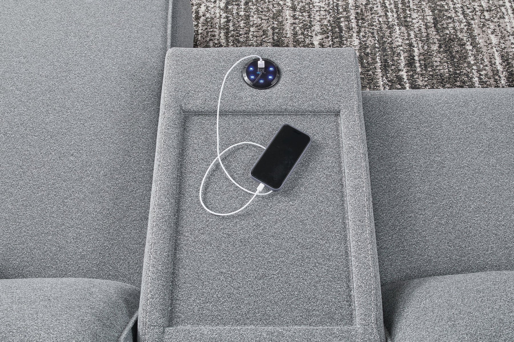 Details | Includes 6 modular pieces: left-arm facing power recliner, power armless recliner, armless chair, console, wedge and right-arm facing power reclining back chaise, "Left-arm" and "right-arm" describe the position of the arm when you face the piece, Versatile modular pieces fit together in a variety of configurations, One-touch power control with adjustable positions, Easy View™ adjustable headrest and zero-draw USB port, Zero-draw technology only consumes power when the USB receptacle is in use, Corner-blocked frame with metal reinforced seat; attached seat and back cushions; high-quality foam cushions wrapped in poly fiber, Polyester upholstery; Next-Gen Nuvella™ is a family-friendly fabric that is soft, easy to clean, stain-resistant and durable, Clean fabric with mild soap and water, let air dry; for stubborn stains, use a solution of 4 oz. bleach to 28 oz. water, Throw pillows with easy-to-remove zippered covers for machine washing; pillows with soft polyfill, Console with removable plexiglass top and 2 cup holders, Zero wall recliner design requires minimal space between wall and chair back, Power cord included; UL Listed | |