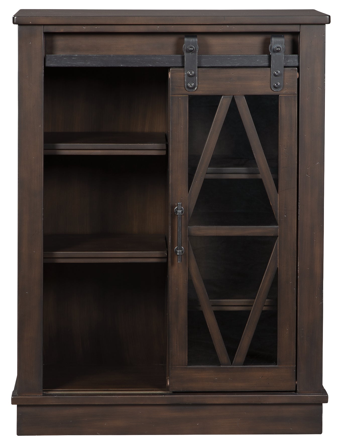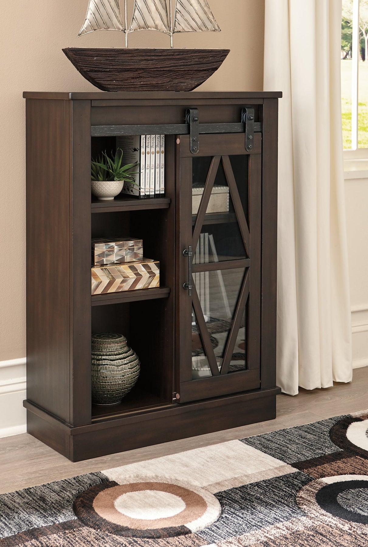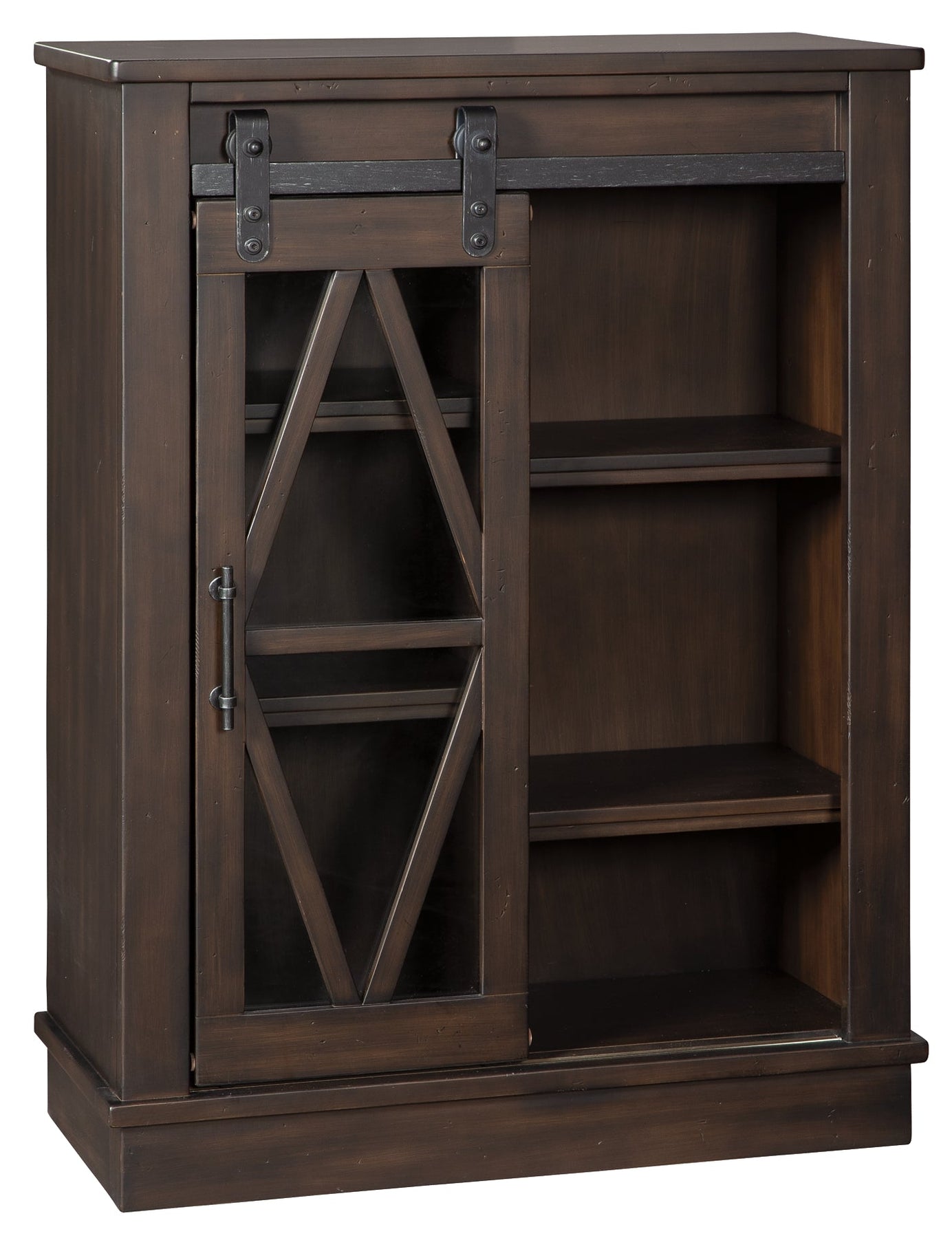 Details | Made of wood and engineered wood, Black finished metal hardware, Sliding door with glass panel front, 4 adjustable shelves, Assembly required | |