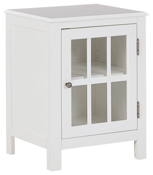 Details | Made of solid and engineered wood in white finishes, Lattice door front with inset clear glass, Metal door pull in pewter finish, 1 doors and 1 shelf, Assembly required | |