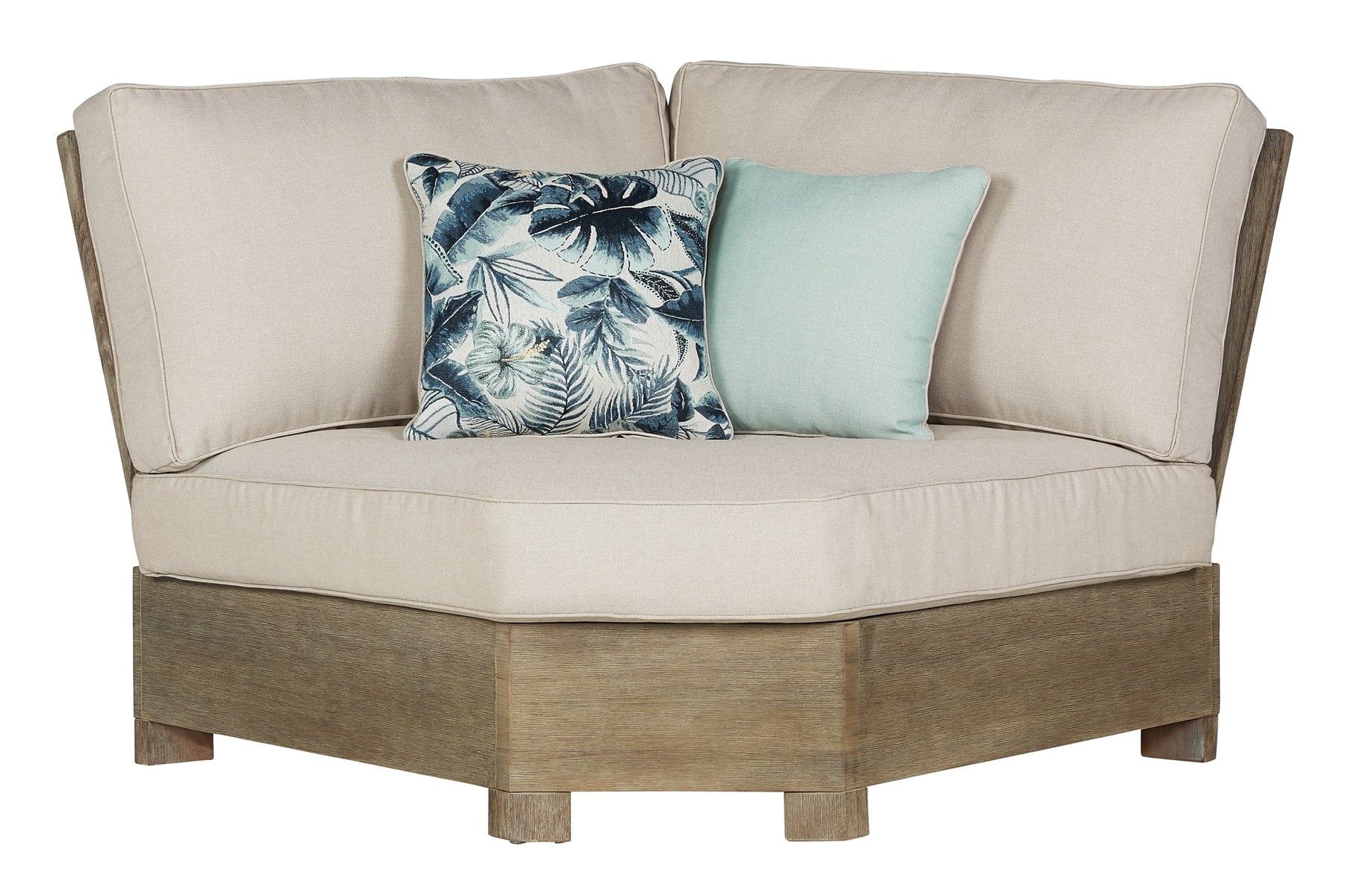Details | Includes 3-piece outdoor sectional (right-arm facing loveseat, corner chair with cushion and left-arm facing loveseat) and armless chair, Left-arm and "right-arm" describe the position of the arm when you face the piece, Made of eucalyptus wood, Multi-step embossed finish, Seat backs/cushions and throw pillows covered in solution-dyed Nuvella® (polyester) high-performance fabric, All-weather foam cushion core wrapped in soft polyester, Throw pillows included, Clean fabric with mild soap and water, let air dry, Imported fabric and fill, Assembly required | |