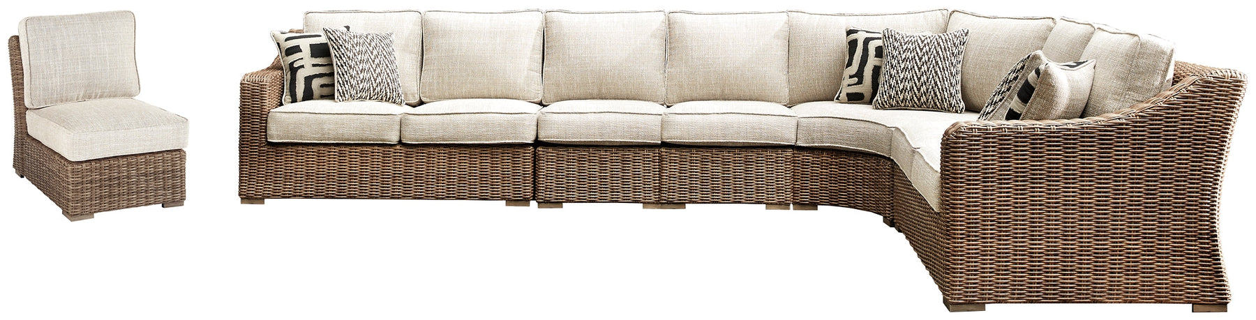 Details | Includes 3 armless chairs with cushions, curved corner chair with cushion, left-arm facing loveseat and right-arm facing loveseat, "Left-arm" and "right-arm" describe the position of the arm when you face the piece, All-weather resin wicker handwoven over powder coated rust-proof aluminum frames, Throw pillows included, Zippered cushions and throw pillows covered in high-performing Nuvella® fabric, All-weather foam cushion core wrapped in soft polyester, Clean fabric with mild soap and water, let air dry; for stubborn stains, use a solution of 1 cup bleach to 1 gallon water, Imported fabric and fill, Assembly required | |