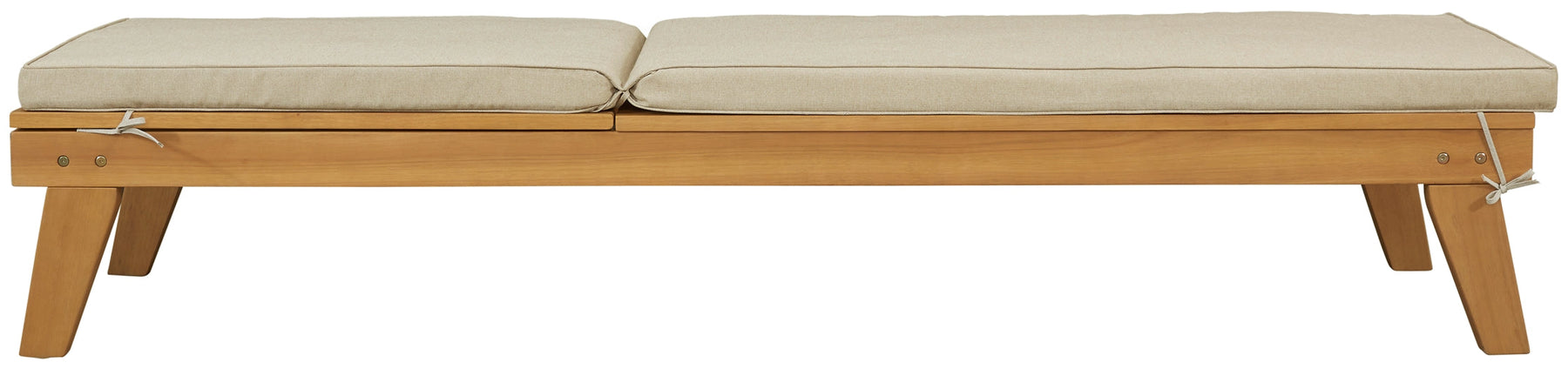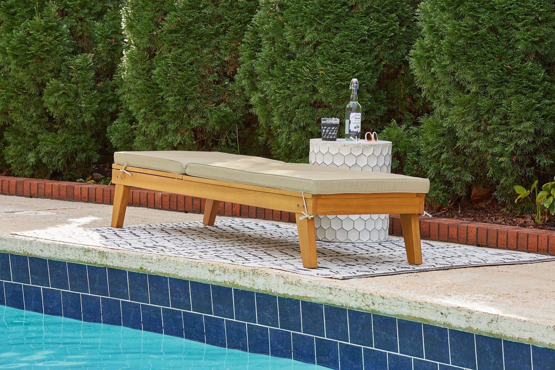Details | Made of eucalyptus wood, Cushion covered in solution-dyed Nuvella® (polyester) high-performance fabric, All-weather foam cushion core wrapped in soft polyester, Clean fabric with mild soap and water, let air dry; for stubborn stains, use a solution of 1 cup bleach to 1 gallon water, Imported fabric and fill, Chaise lounge with multiple recline positions, Lays flat for sunbathing on either side, Assembly required | |