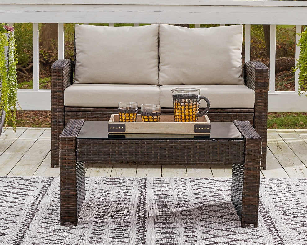 Details | Includes outdoor loveseat and coffee table, Made of solid steel and high-quality resin wicker, Coffee table with black tempered glass top, Seat and back cushions covered in solution-dyed Nuvella® (polyester) high-performance fabric, All-weather foam cushion core wrapped in soft polyester, Clean fabric with mild soap and water, let air dry; for stubborn stains, use a solution of 1 cup bleach to 1 gallon water, Assembly required | |