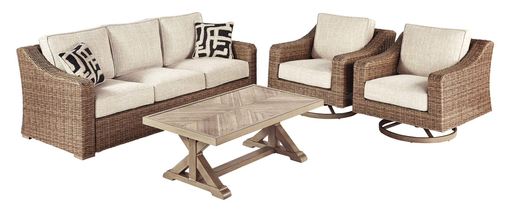 Details | Includes sofa with cushions, 2 swivel chairs with cushions and coffee table, Table with all-weather, rust-resistant, powder coated aluminum base and porcelain top, Sofa and chairs with all-weather resin wicker handwoven over powder coated rust-proof aluminum frames, 2 throw pillows included, Swivel chairs with 360-degree turning radius, Zippered cushions and throw pillows covered in high-performing Nuvella® fabric, All-weather foam cushion core wrapped in soft polyester, Clean fabric with mild soap and water, let air dry; for stubborn stains, use a solution of 1 cup bleach to 1 gallon water, Imported fabric and fill, Assembly required | |