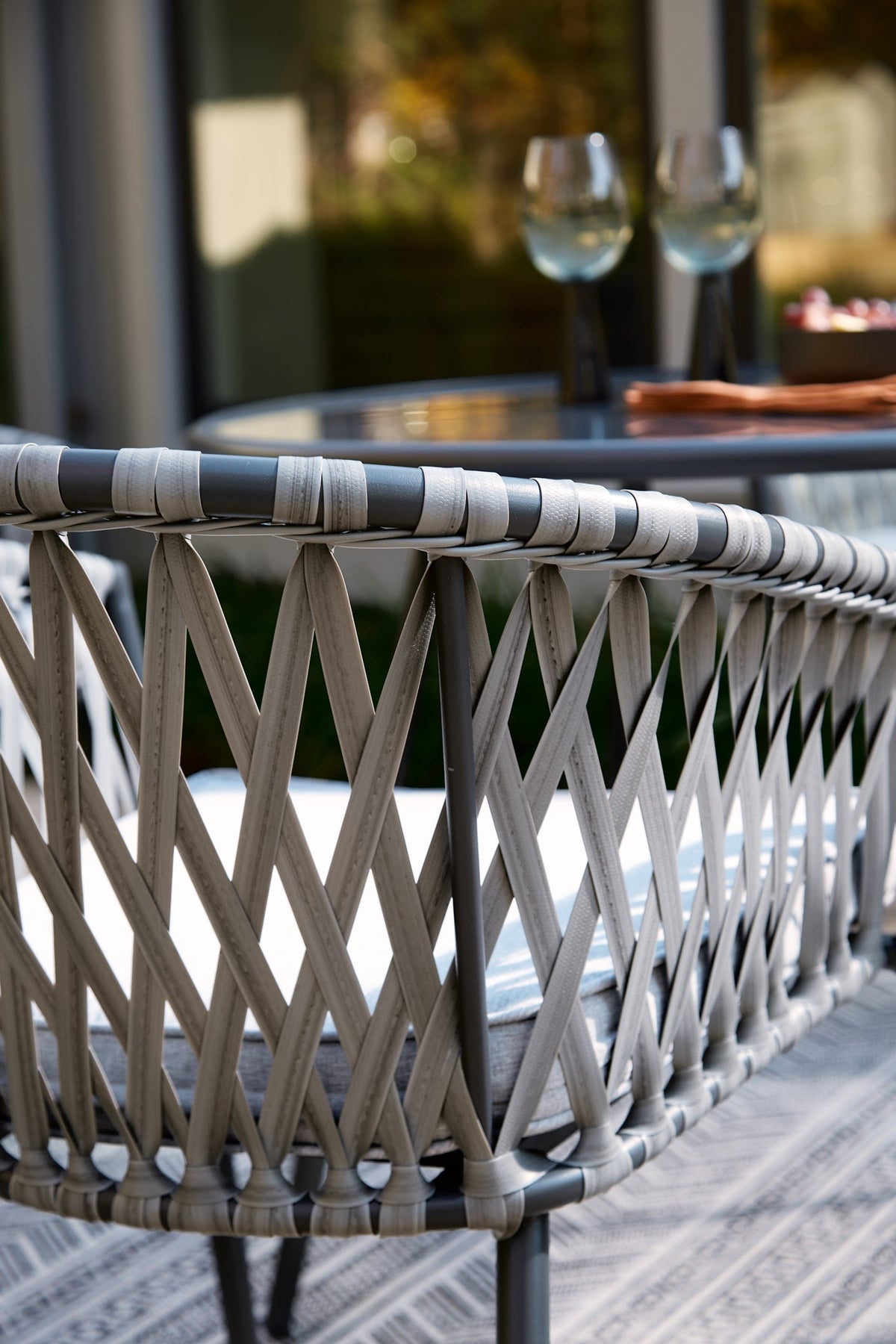 Details | Includes 4 chairs, Made with woven wicker over powder coated steel frame, Stainless steel hardware, Easy-clean polyester (Nuvella®) upholstery remains vibrant and resists stains, All-weather foam cushion core wrapped in soft polyester, Stackable design, Clean fabric with mild soap and water, let air dry; for stubborn stains, use a solution of 1 cup bleach to 1 gallon water, Assembly required | |