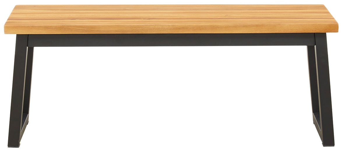 Details | 3-piece outdoor furniture set includes dining table and 2 benches, Tabletop and seats made of acacia wood, Table includes umbrella hole, Steel legs/table base in black powder coated finish, Seats 4, Assembly required | |