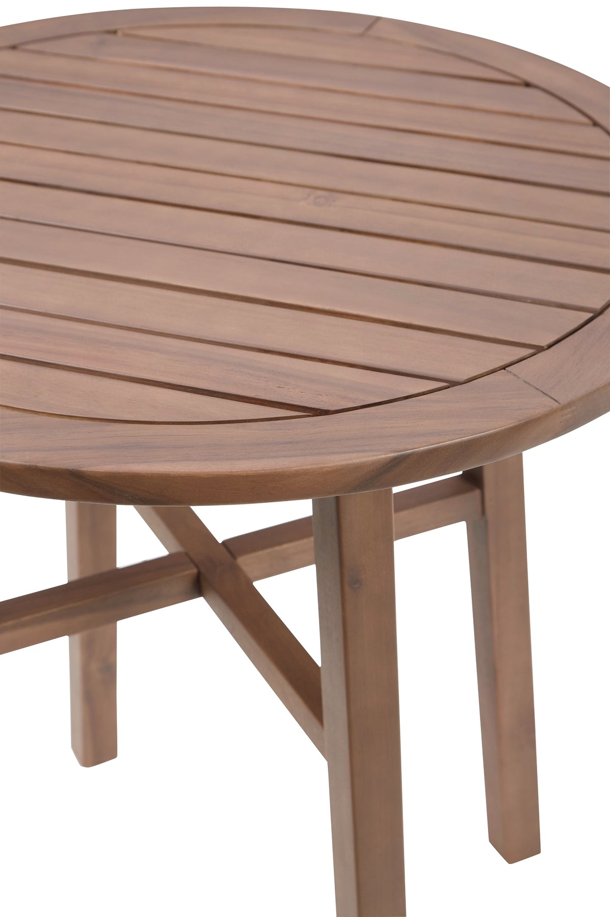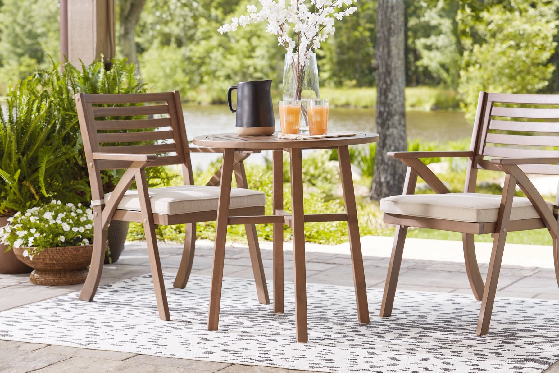 Details | Includes table and 2 chairs, Made with acacia wood, Natural color, Slatted design, Nuvella® (solution-dyed polyester) high-performance fabric, Clean fabric with mild soap and water, let air dry; for stubborn stains, use a solution of 1 cup bleach to 1 gallon water, Assembly required | |