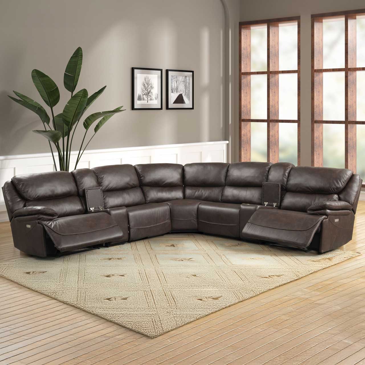 Relax in style with the Ardent 7-Piece Power Reclining Sectional, upholstered in rich brown leather gel for a luxurious look and feel. This spacious sectional features plush cushions, power reclining seats, and a durable design that ensures long-lasting comfort. Equipped with a built-in console with storage and cup holders, it offers the perfect combination of functionality and elegance. Ideal for gatherings or quiet nights in, this sectional transforms your living space into a haven of relaxation and sophistication.