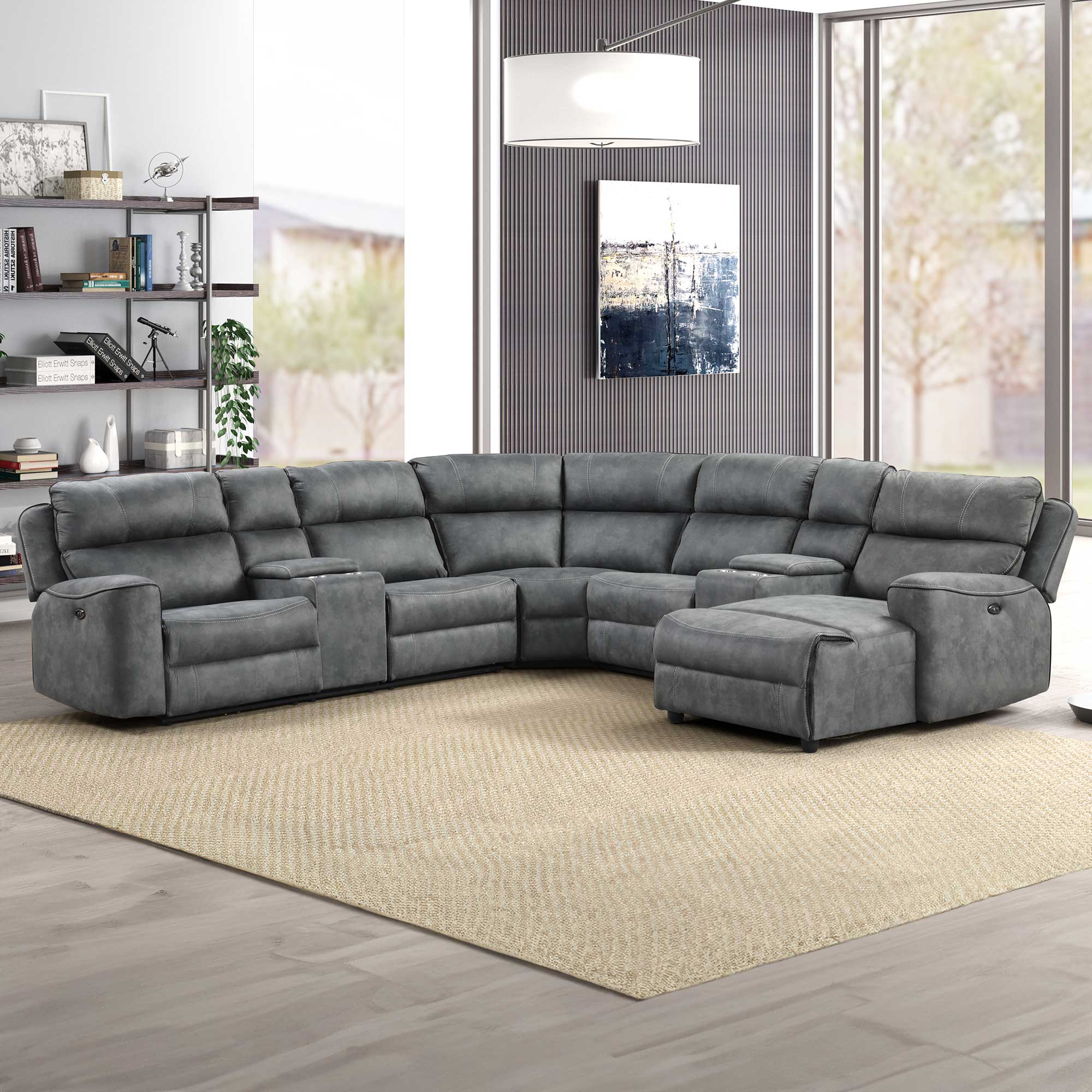 Upgrade your living space with the Orlando 4-Piece Gray Power Reclining Sectional, a perfect blend of comfort, style, and functionality. Upholstered in soft gray fabric, this sectional features plush, padded seating with ergonomic lumbar support for ultimate relaxation. The power reclining function allows effortless adjustment at the push of a button, while the built-in USB ports and power outlets keep your devices charged and within reach. Two storage consoles with integrated cup holders provide convenient space for drinks and essentials. The spacious chaise lounge offers extra room to stretch out, making this sectional an ideal centerpiece for any modern home.