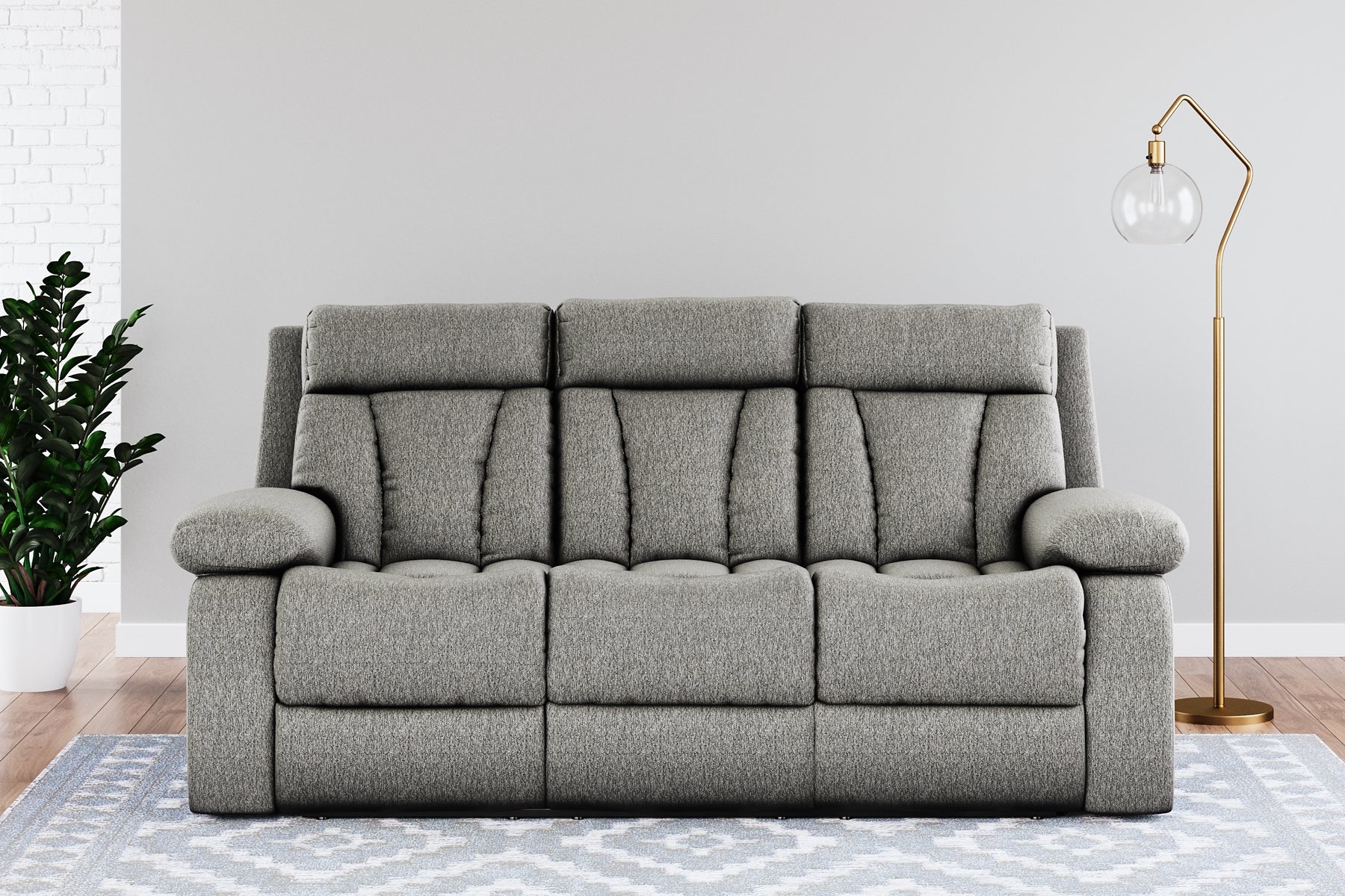 Details | Dual-sided recliner; middle seat remains stationary, Drop-down center table with 2 cup holders, Pull tab reclining motion, Corner-blocked frame with metal reinforced seat, Attached back and seat cushions, High-quality foam cushions wrapped in poly fiber, Polyester upholstery | |