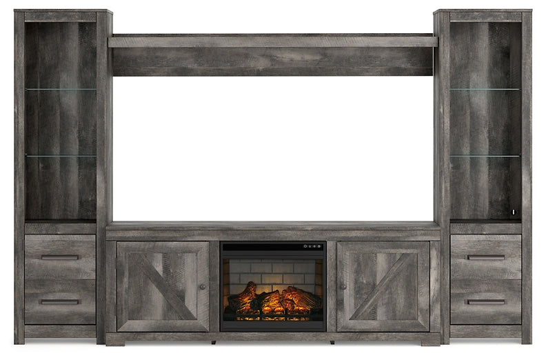 Details | Includes TV stand, bridge, 2 piers and electric infrared fireplace insert (W100-101), Made with engineered wood (MDF/particleboard), Rustic gray finish over replicated oak grain, Plank effect, TV stand with 2 storage cabinets (each with an adjustable shelf); removable/adjustable center shelf, Cutouts for wire management and ventilation, Pier with 2 glass shelves and cabinet door revealing single-shelf storage; overhead LED lighting, Fireplace provides up to 5,386 BTU/1,500W and warms up to 1,000 square feet (heats larger rooms), 7-level temperature setting, multi flame system, 5 brightness levels and LED glowing ember effect, LED flame operates with or without infrared heat, Remote control with LED display; programmable timer will turn off the unit after a set period of time, UL Listed; power cord included, Simply remove the center shelf and back panel to make room for the fireplace insert | |
